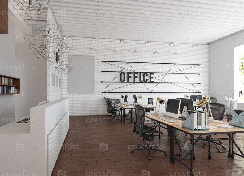 Открытое офисное пространство для совместной работы с промышленным дизайном. 3D-рендеринг