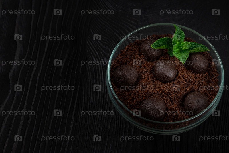 Шоколадный десерт из печенья с кусочками шоколада и мяты на темном деревянном фоне с кописпейсом, концепцией еды и напитков