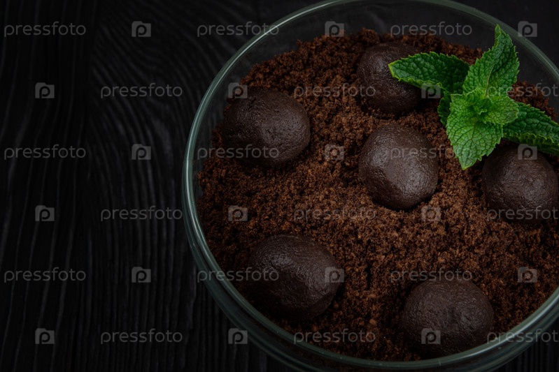 Шоколадный десерт из печенья с кусочками шоколада и мяты на темном деревянном фоне с кописпейсом, концепцией еды и напитков