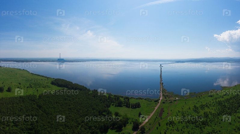 Вид с воздуха с беспилотника на ландшафт озера и дорогу