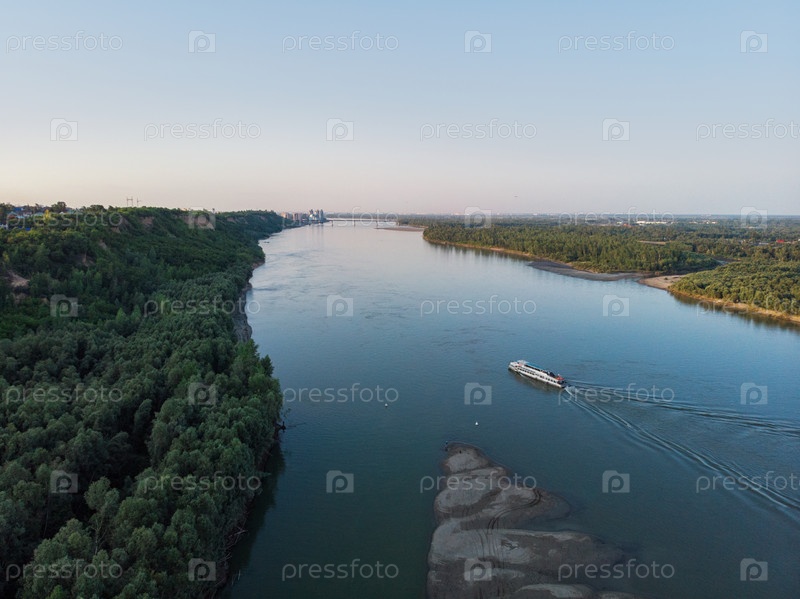 Вид с воздуха на большую сибирскую реку Обь и корабль, летний день, снимок с дрона