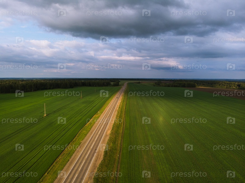 Вид сверху на дорогу летним вечером. Вид с дрона