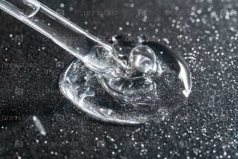 Красивая пипетка-капельница с сывороткой для лица на черном блестящем фоне. Презентация продукта по уходу за кожей