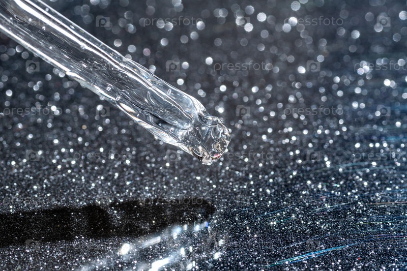 Крупный план косметической пипетки с жидким гелем или сывороткой на черном мерцающем фоне. Презентация косметики по уходу за кожей