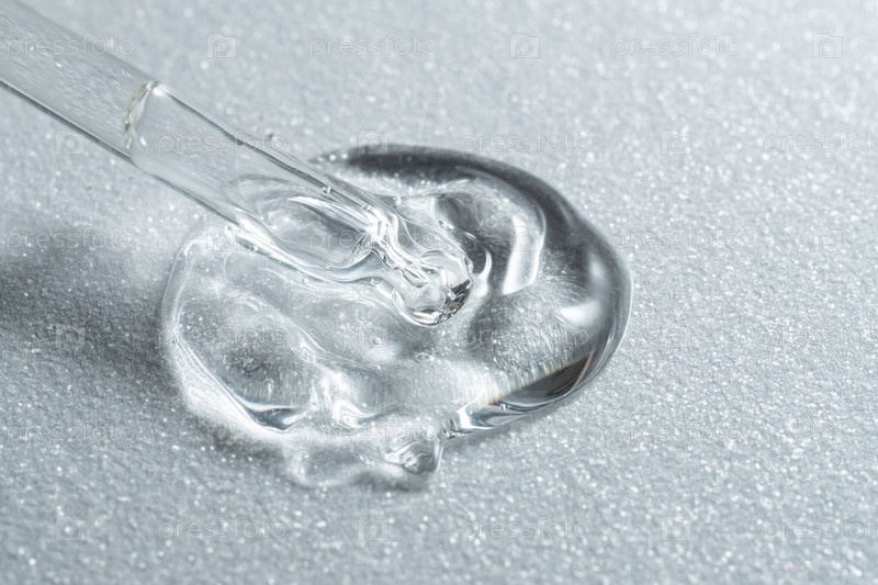 Образец текстуры геля-сыворотки. Прозрачная капля на белом фоне боке. Средство по уходу за кожей лица. Жидкая масляная эссенция. Всплеск коллагена красоты. Органический пилинг. Уход за здоровьем тела