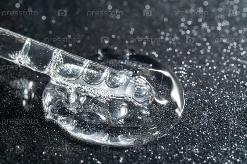Крупный план косметического масла или сыворотки для лица в прозрачной бутылке-капельнице на черном сверкающем фоне. Гиалуроновая кислота в стеклянной пипетке. Роскошный уход за лицом