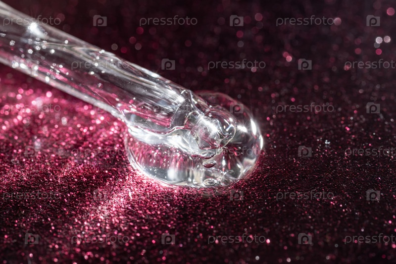 Пипетка Сыворотка для лица крупным планом на модном сверкающем розовом фоне. Коллаген, гиалуроновая кислота для ухода за кожей. Достижения современной науки в косметике для сохранения красоты. Копировать пространство