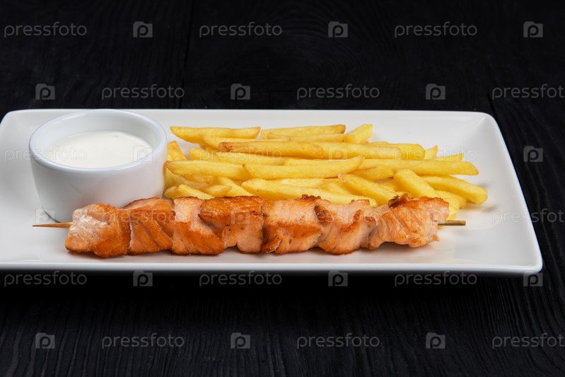 Шашлык из лосося на гриле с жареным картофелем и соусом на белой тарелке на черном деревянном фоне