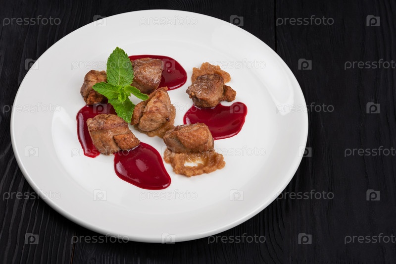 Деликатес Жареное свиное мясо с пюре из цуккини и ягодным соусом, украшенное мятой на белой тарелке на черном деревянном фоне