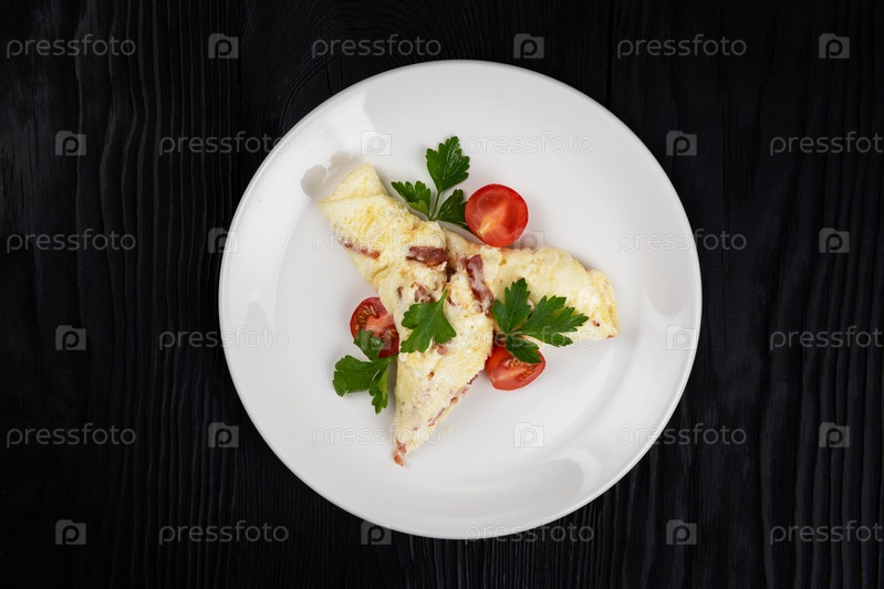 Омлет с ветчиной и сыром на черном деревянном фоне
