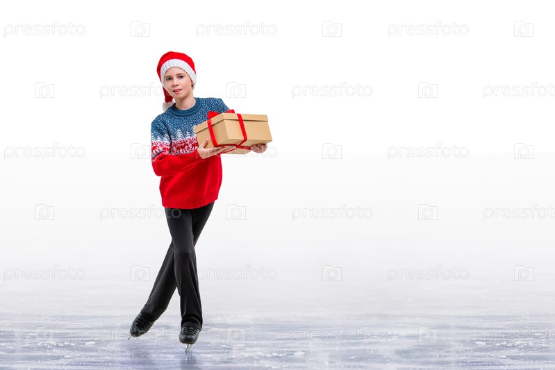 Мальчик-фигурист в шапке Санта-Клауса катается на льду, изолированном на белом фоне. Зимние виды спорта для детей. Рождественская открытка с местом для копирования