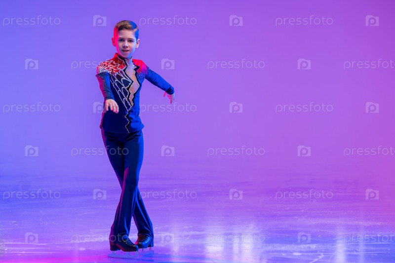 Мальчик-фигурист катается на льду. С праздничной сиреневой подсветкой