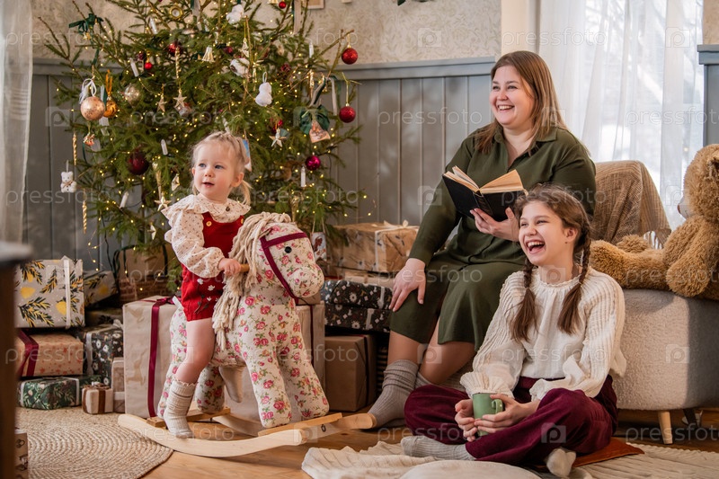 Семья с детьми отдыхает в интерьере загородного дома на фоне новогодней елки