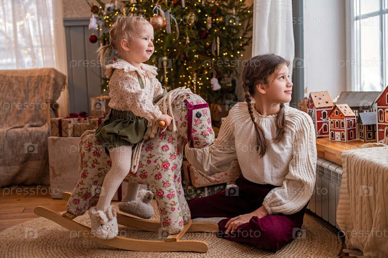 Две девочки играют с лошадкой-качалкой на фоне новогодней елки