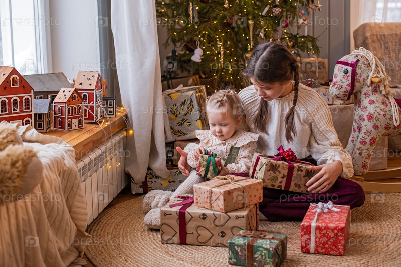 Две сестры сидят рядом с елкой и подарками в интерьере загородного дома. Теплая уютная атмосфера в винтажном стиле кантри