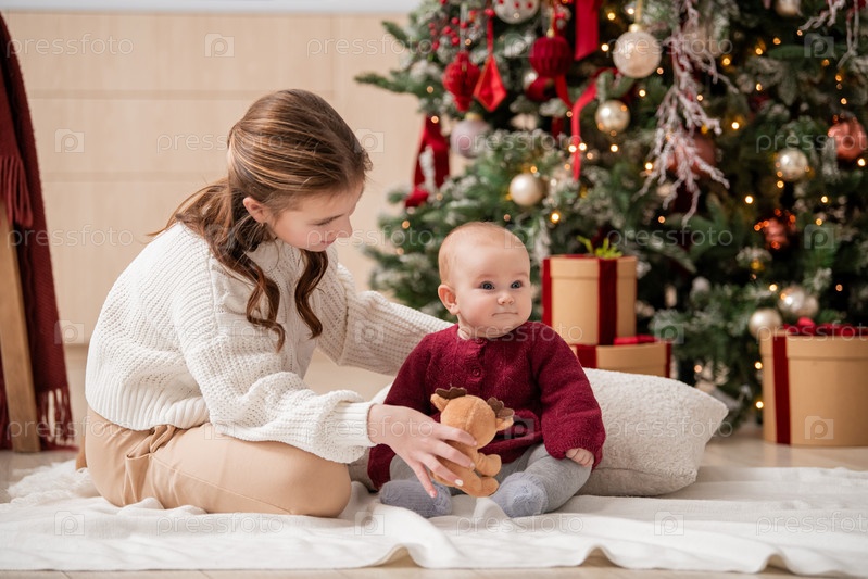 Старшая сестра играет с ребенком в домашнем интерьере возле рождественской елки