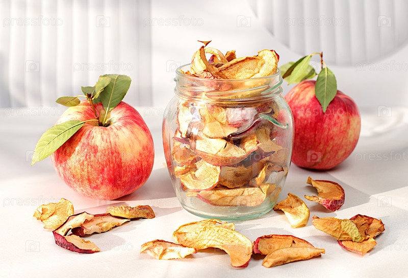 Домашние сушеные ломтики яблок на кухонном столе, Яблочные чипсы в стеклянных банках на солнечном фоне, Детокс-диета и концепция снижения веса, Натуральная пища для здорового образа жизни, Реклама магазина,