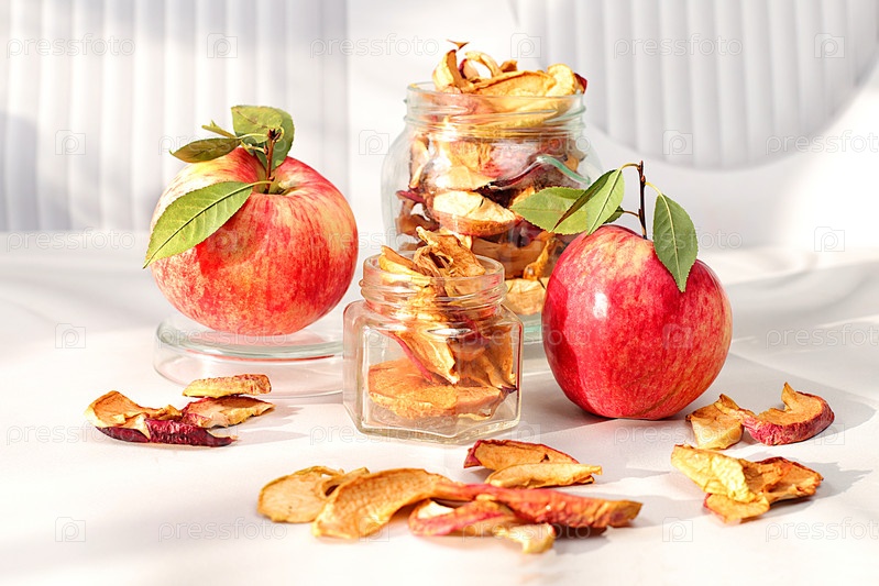 Яблочные чипсы в стеклянных банках на солнечном фоне, детокс-диета и концепция снижения веса, домашние сушеные яблочные ломтики на кухонном столе, натуральная пища для здорового образа жизни, реклама магазина,