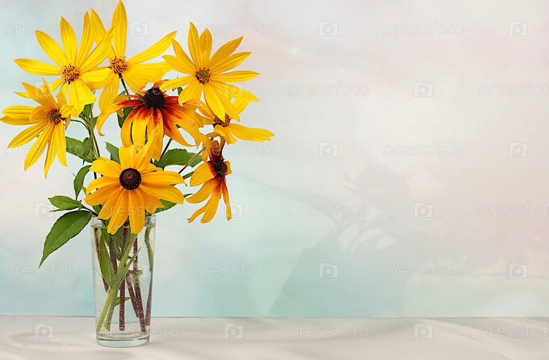 Осенний баннер с красивыми цветами в вазе на солнечном фоне, сезонный натюрморт с рудбекией, абстрактная цветочная композиция, праздничная открытка, селективный фокус