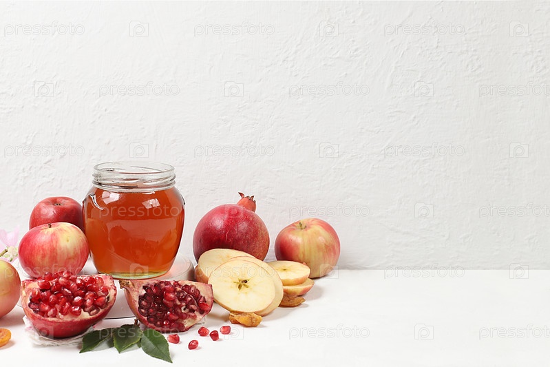 Осенний баннер с медом, яблоками, гранатами, цветами, сухофруктами на светлом фоне, композиция для еврейского праздника Рош ха-Шана, концепция приветствия осени и благодарения, выборочный фокус, с местом для копирования