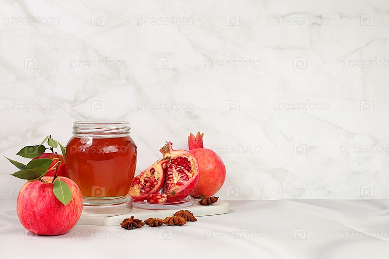 Композиция для еврейского праздника Рош ха-Шана, осенний баннер с медом, яблоками, гранатами на светлом фоне, осеннее приветствие и концепция благодарения, выборочный фокус, с местом для копирования