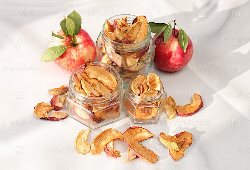 Яблочные чипсы в стеклянных банках на солнечном фоне, детокс-диета и концепция снижения веса, домашние сушеные яблочные ломтики на кухонном столе, натуральная пища для здорового образа жизни, реклама магазина,