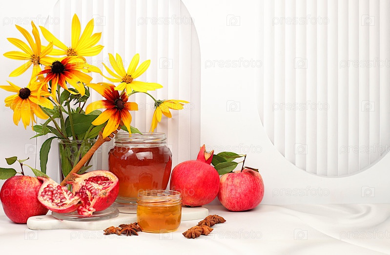 Осенний баннер с медом, яблоками, гранатами, цветами, сухофруктами на светлом фоне, композиция для еврейского праздника Рош ха-Шана, концепция приветствия осени и благодарения, выборочный фокус, с местом для копирования