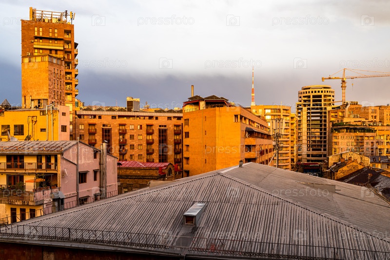 Городские дома, освещенные оранжевым закатным солнцем в Ереване