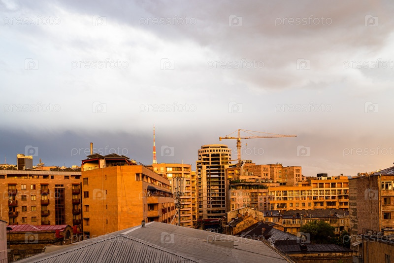 Облачное вечернее небо над жилым районом Еревана