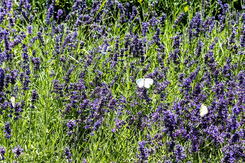 Бабочки и цветущая лаванда на зеленом поле