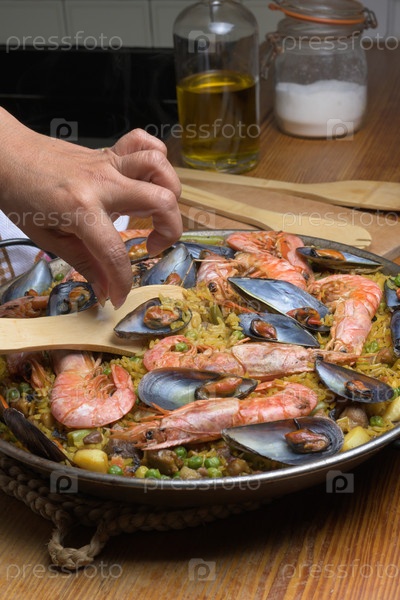 Приготовление паэльи с креветками и мидиями с использованием деревянной посуды на домашней кухне, традиционная испанская кухня, Майорка, Балеарские острова, Испания,