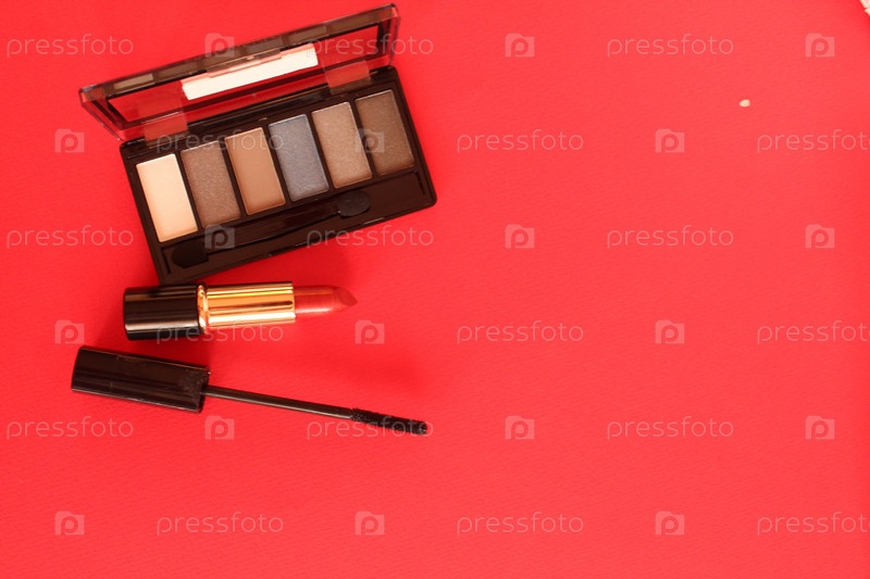 Инструменты для макияжа на красном фоне с текстовым пространством coisspace верхний угол