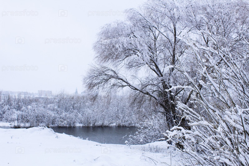 Река зимой. Река зимой безо льда и снега. Деревья под снегом на берегу реки