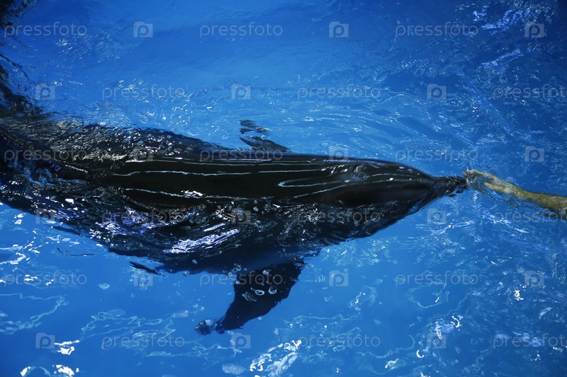 Дельфин плавает в дельфинарии, рядом рука дрессировщика