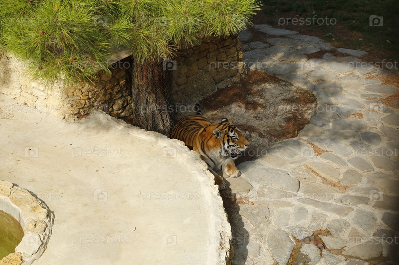 Территория "Сафари-Парк" город Геленджик. Тигр отдыхает в тени деревьев в жаркий день