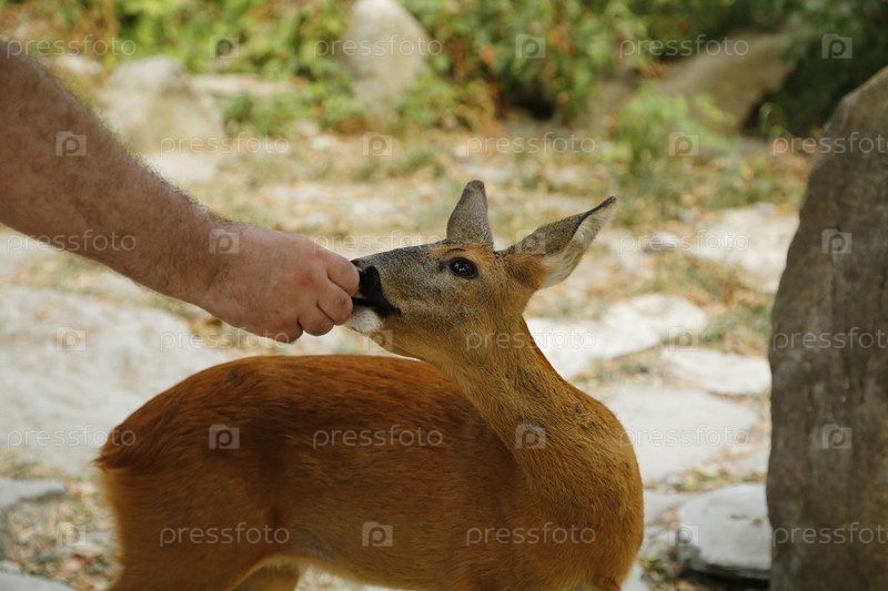 Молодая косуля гуляет в горном лесу. Человек кормит косулю