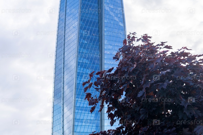 Современная архитектура, ландшафтный дизайн, красная листва на фоне современных зданий на фоне неба