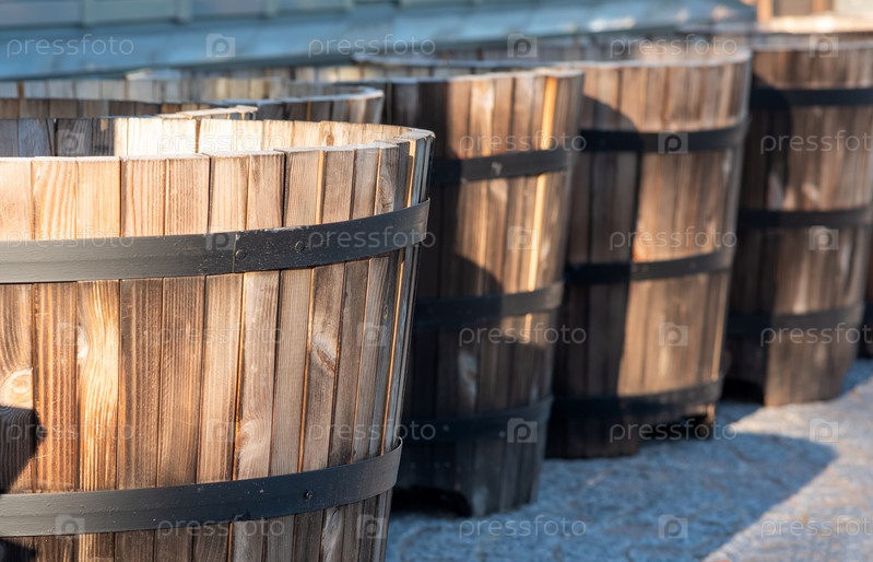 Деревянные горшки для растений у стены теплицы