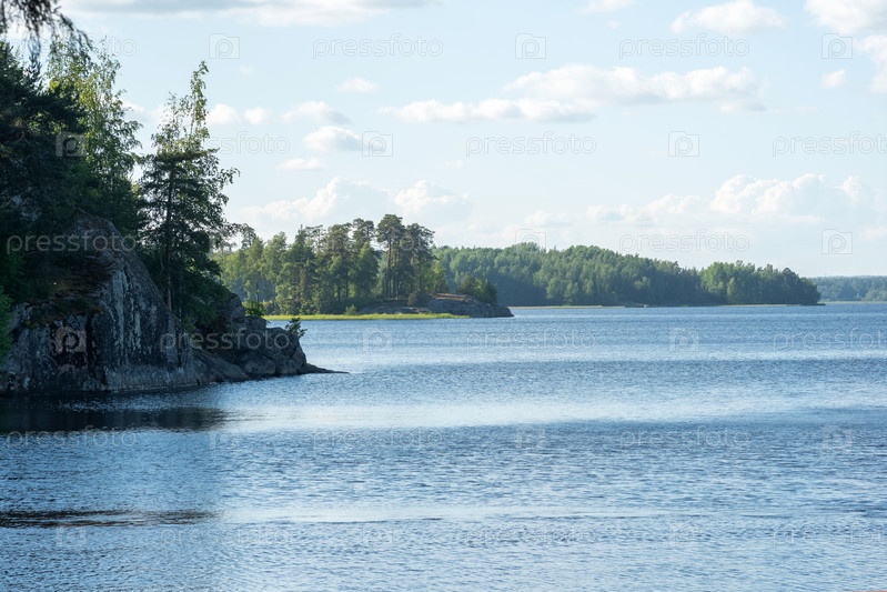 Естественный водный ландшафт, мелководный залив со скалистыми лесистыми берегами