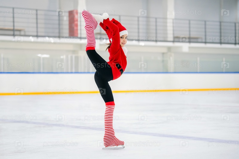 Маленькая девочка-фигуристка в костюме Санта-Клауса катается на льду крытой арены. Рождественский праздник для спортсменов