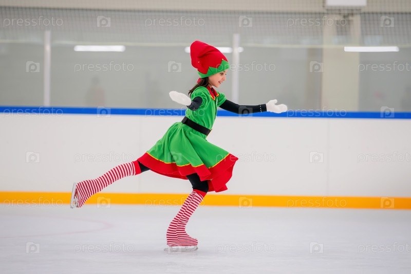 Маленькая девочка-фигуристка, одетая как рождественский эльф, катается на льду крытой арены