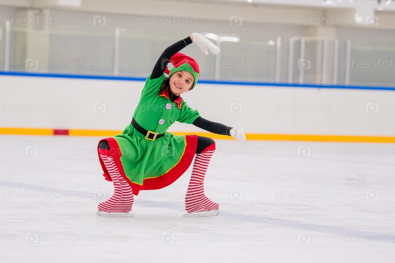 Маленькая девочка-фигуристка, одетая как рождественский эльф, катается на льду крытой арены