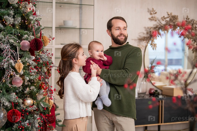 Отец с двумя детьми сидит среди подарочных коробок и игрушек в домашнем интерьере рядом с рождественской елкой. Зимние праздники и семейная концепция