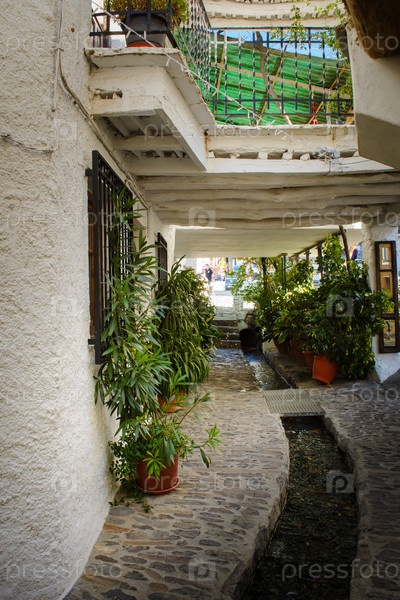 Узкий деревенский переулок с мощеными дорожками, белыми стенами и текущей водой, окруженный зеленью, Альпухаррас, Гранада, Андалусия, Испания,