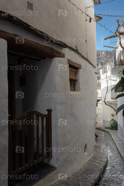 Белый узкий переулок с деревянными перилами и деревенской архитектурой под ярким солнечным небом, Альпухаррас, Гранада, Андалусия, Испания,