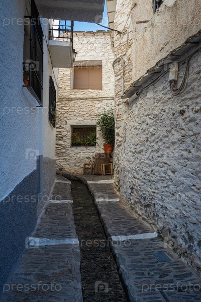 Небольшой ручей, текущий по узкой аллее белых зданий под ярко-голубым небом, Альпухаррас, Гранада, Андалусия, Испания,