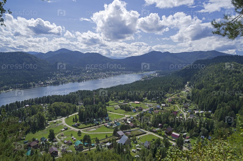 Вид на село Артыбаш со смотровой площадки, расположенной на склоне горы. Берег Телецкого озера, Алтай, Россия. Солнечный день в августе