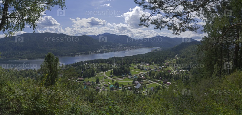 Вид на село Артыбаш со смотровой площадки, расположенной на склоне горы. Берег Телецкого озера, Алтай, Россия. Солнечный день в августе