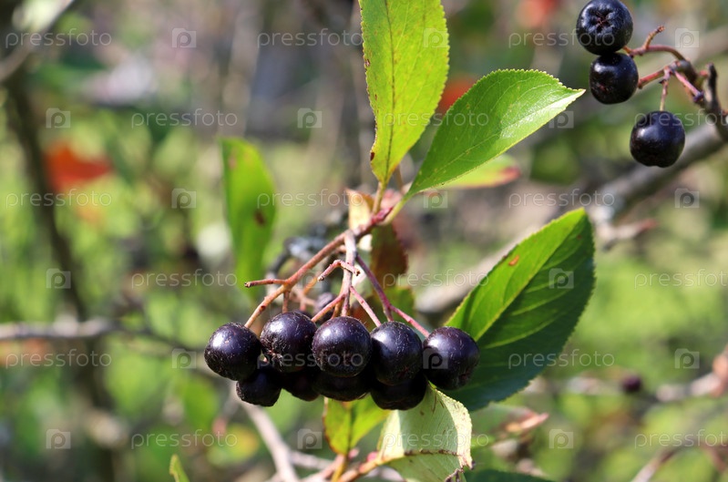 Гроздь спелых ягод черноплодной рябины в саду летом