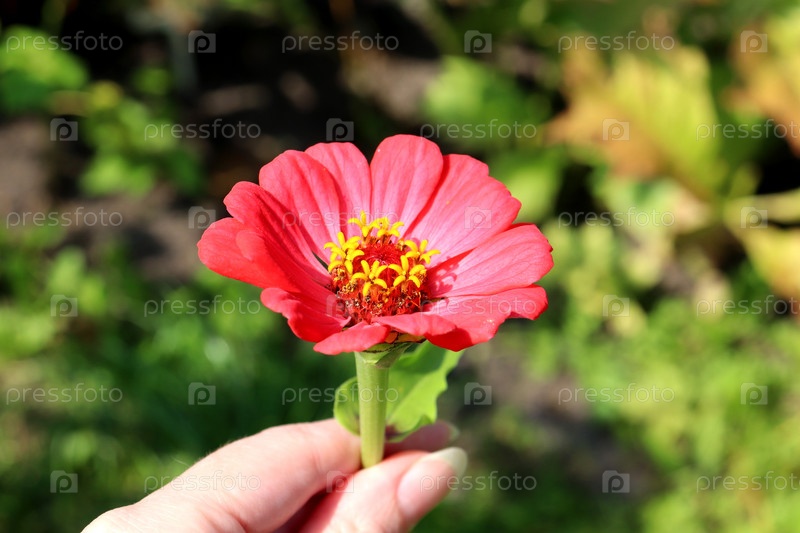 Коралловая цинния в женской руке на фоне сада летом